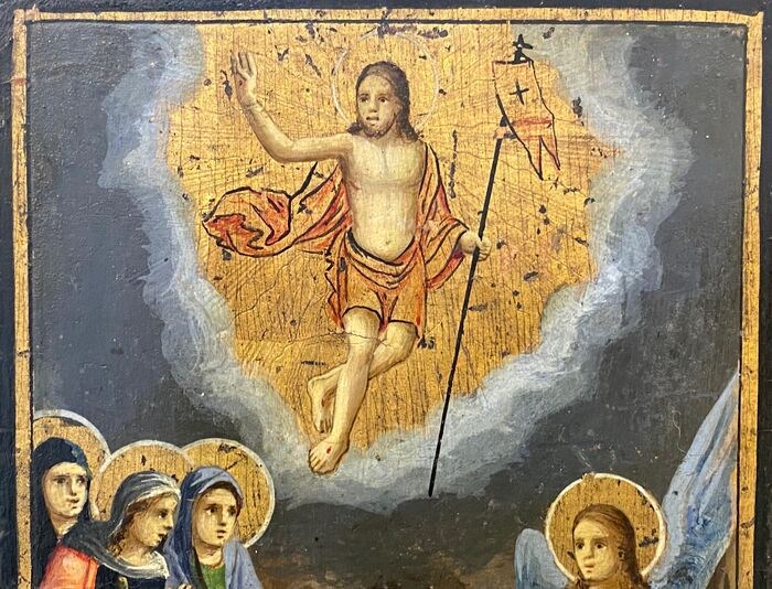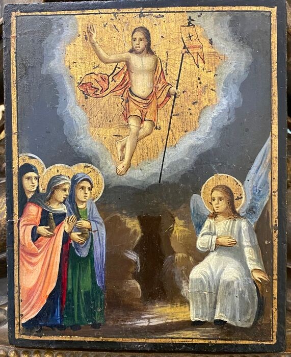 hier is de originele paasgebeurtenis - de 3 Maria's bij het lege graf van Christus met de verrezen Christus erboven
