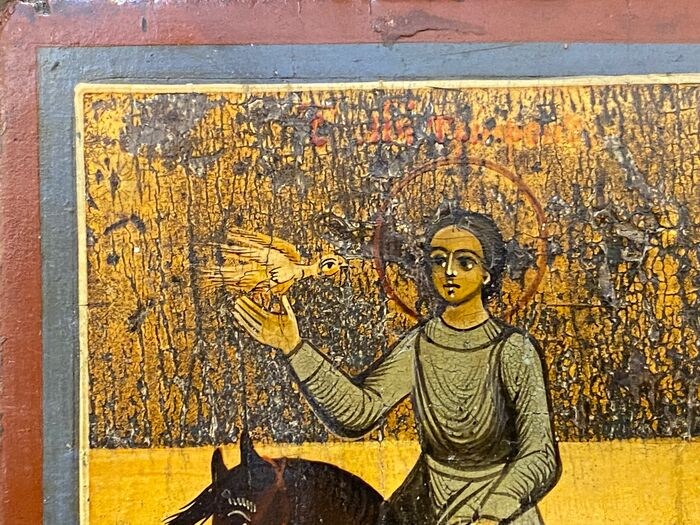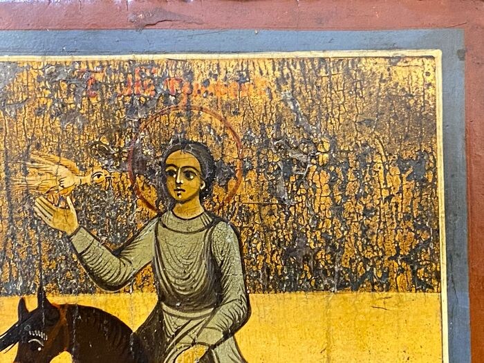 de rand van de icoon is later vernieuwd, het binnenveld heeft nog de originele patina