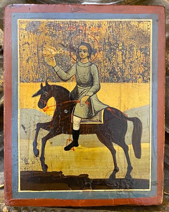 de heilige is hier afgebeeld op een paard met een vogel (gans) in zijn rechterhand