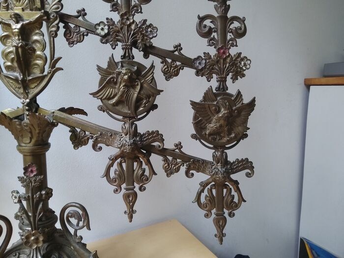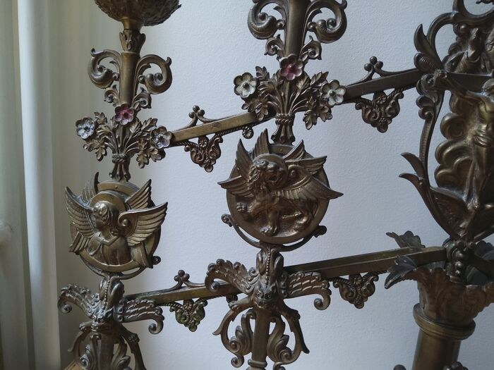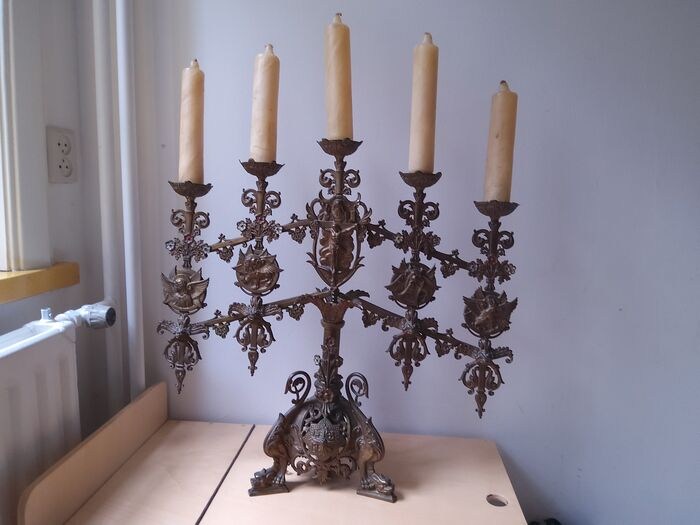 Kapitale antieke kandelaar compleet met 5 kaarsen (ongebruikt). Frans of Belgisch. Waarschijnlijk 19de eeuw. Standaard met armen kan uit de voet genomen worden. Met vermelding Breveté SGDG - Breveté Sans Garantie Du Gouvernement (zonder garantie van overheid op functionaliteit, enz.).