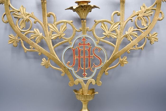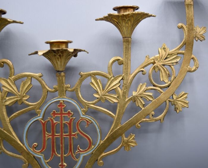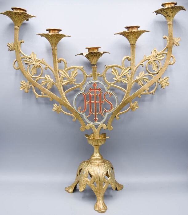 Schitterende kandelaar voor 5 kaarsen van brons/messing met polychroom centraal en staand.