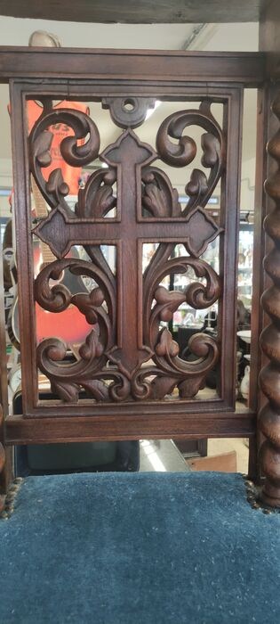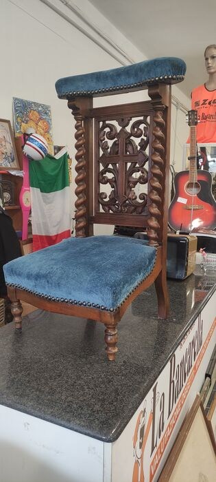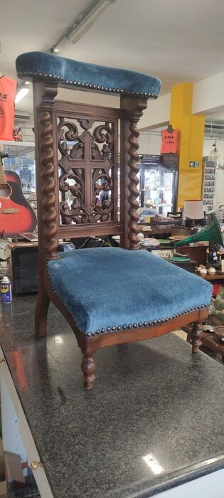 Gesneden prie-dieu met gedraaide kolommen, bekleding in antiek blauw fluweel, vastgeschroefd met koperen sleutels, prachtig kruis uitgesneden op de rugleuning, volledig gerestaureerd in de jaren 80, midden 19e eeuw, zeldzaam.