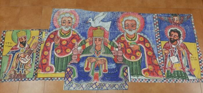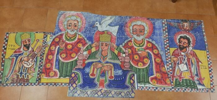 Enorm altaarstro van de Koptische religie, geschilderd in tempera op canvas in de vroege jaren 1900. De Koptisch-Katholieke Kerk is een van de Oosters-Katholieke kerken, die zich afscheidde van de Koptisch-Orthodoxe Kerk en in gemeenschap stond met de Kerk van Rome. Ik denk dat het uit de Hoorn van Afrika komt, en meet 270x110 cm op de maximale punten. Het doek is jarenlang gevouwen geweest en op sommige plaatsen ontbreekt de polychromie. Het komt uit de collectie van een voormalig ambtenaar van de Italiaanse ambassade in de hoorn van Afrika.