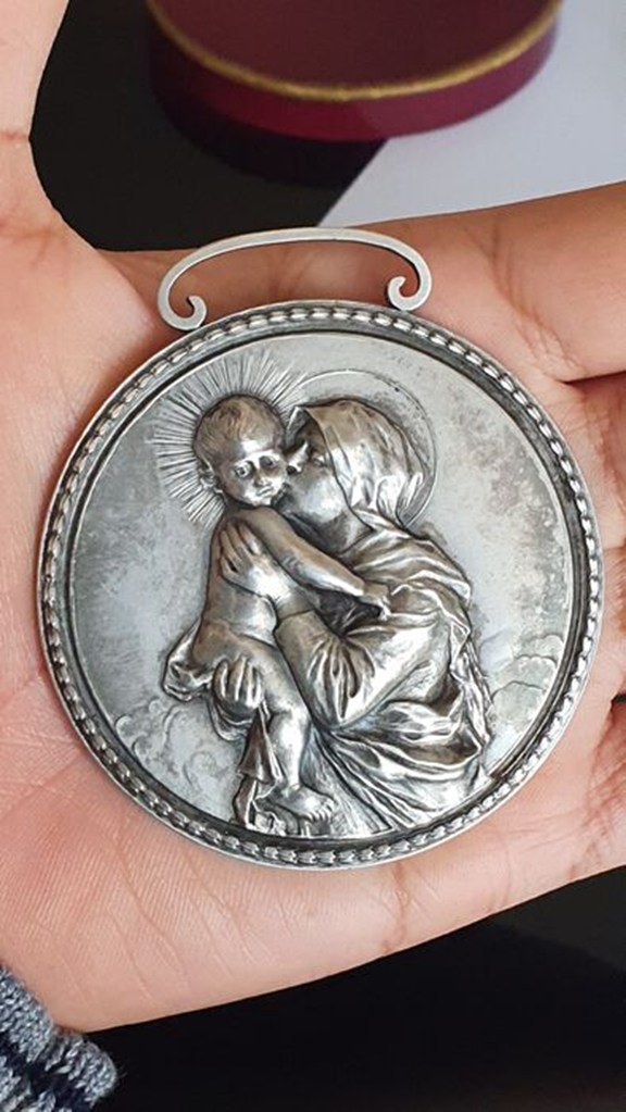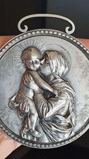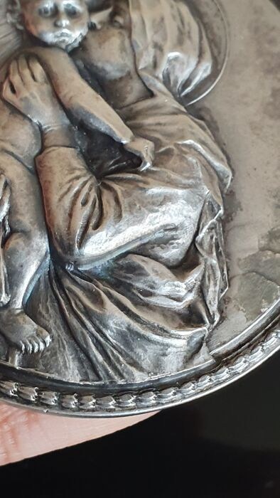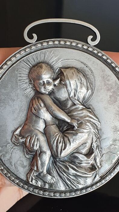 Zeldzame massief zilveren penning met in reliëf de afbeelding van de Madonna met Kind.