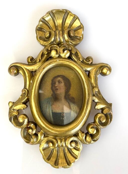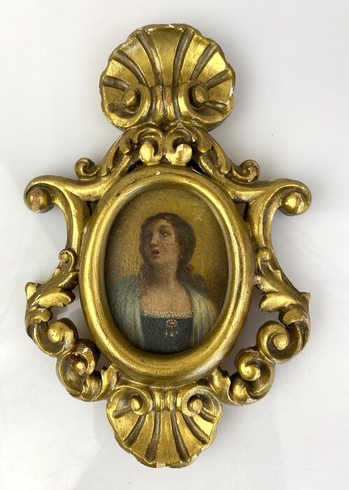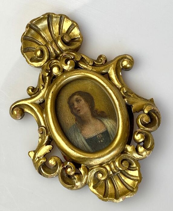 Verfijnde miniatuur in een vergulde houten lijst, voorstellende een vrouwengezicht.