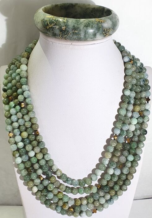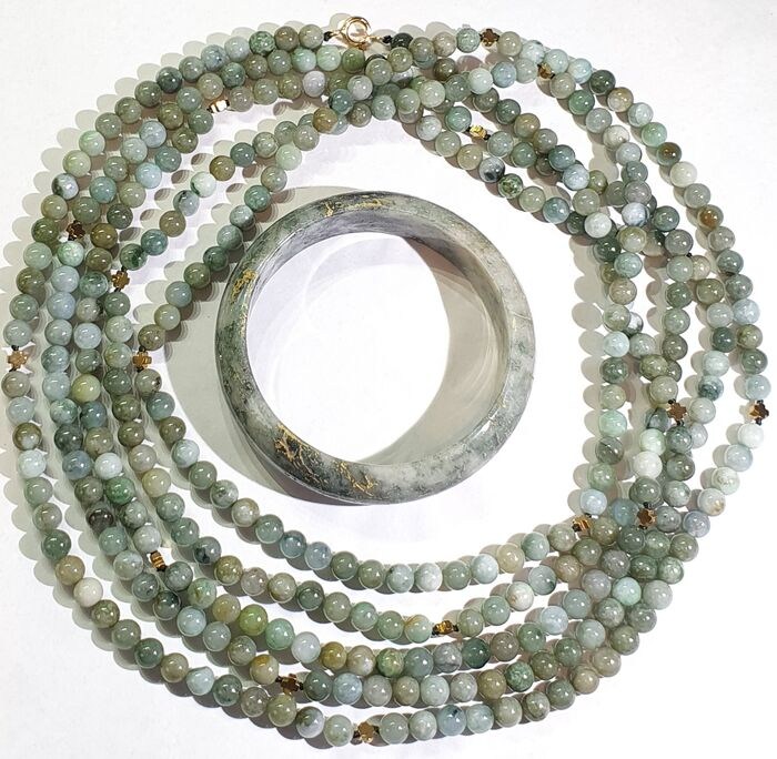 Ik bied ter veiling aan een spectaculaire zeer lange ketting en armband van vergulde hematiet Griekse kruisen (bescherming en balans) en groene jade van de hoogste kwaliteit. De hele ketting is met de hand gesponnen met knopen aan elk kruis en de sluiting is gemaakt van verguld 925 zilver