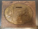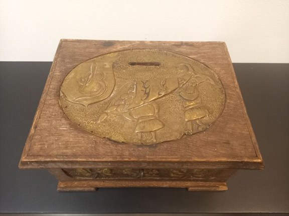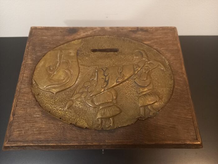 Een religieus offerblok of geldkistmet koperen handgemaakte plaquettes met oude symboliek van eventueel Sint Nikolaas met snoepgoed zakof carnavaleske snoepzak en klavers vier aan de zijdes (zeer oud middeleeuws symbool).