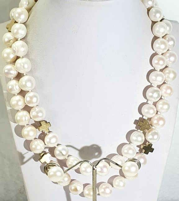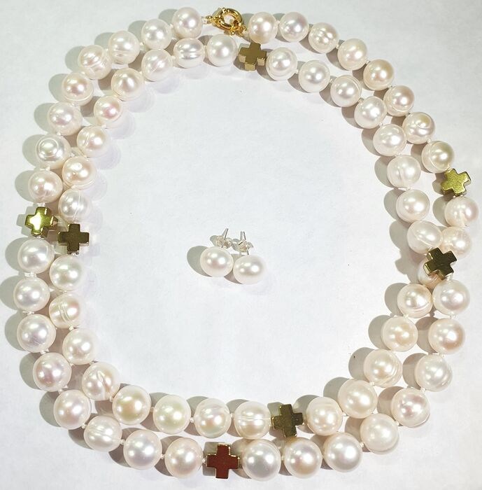Ik bied ter veiling een spectaculaire lange ketting en oorbellen van vergulde Griekse kruisen (bescherming & balans) en gigantische zoetwaterparels (klasse AAAA). Het gehele collier is met de hand gesponnen met knopen en de sluiting is gemaakt van verguld 925 zilver (extra large & solid) en zoetwaterparel oorbellen met 925 zilver.