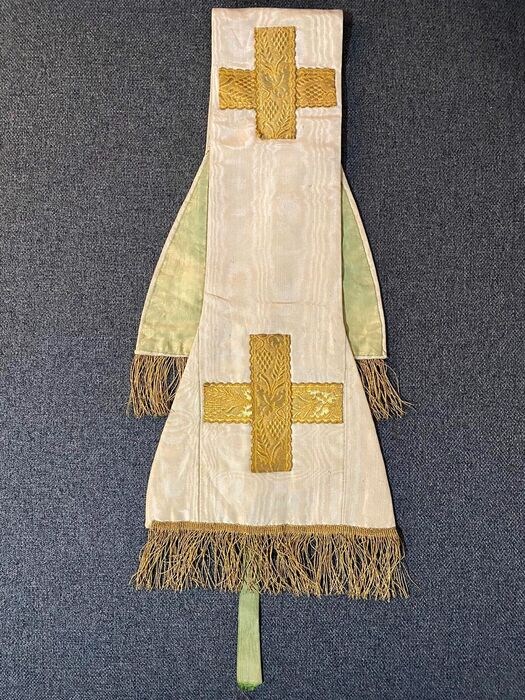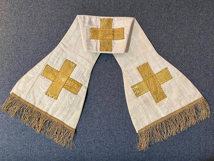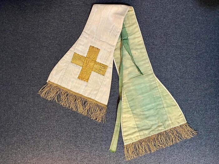 Deze stola dateert uit het einde van de 19e eeuw maar verkeert in uitstekende staat en werd met veters aan de mouwen van het priesterlijk gewaad bevestigd (zoals te zien op de foto).