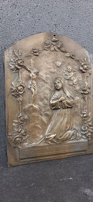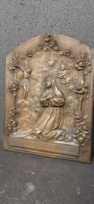 Bronzen plaquette. Het stelt de heilige Clara in gebed voor in een rozentuin met vliegende engelen en het kruisbeeld. Santa Chiara, die in Assisi woonde, trad in de voetsporen van San Francesco, stichtte de Orde van de Arme Clarissen en wordt erkend als patroonheilige van de vergulders, de blinden, de strijkers en de wasvrouwen. Afmeting 27x20cm.