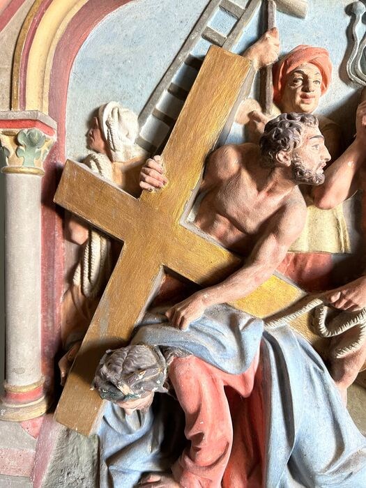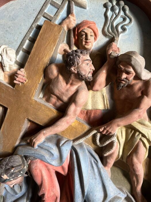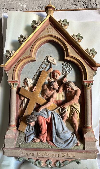 Indrukwekkend reliëf in terraco handgeschilderde letters in goud. Overstekende baan. Enkele chips of pitjes in het reliëf. Ontbrekende bovenafwerking, mogelijk een kruis. Verpakking op maat.