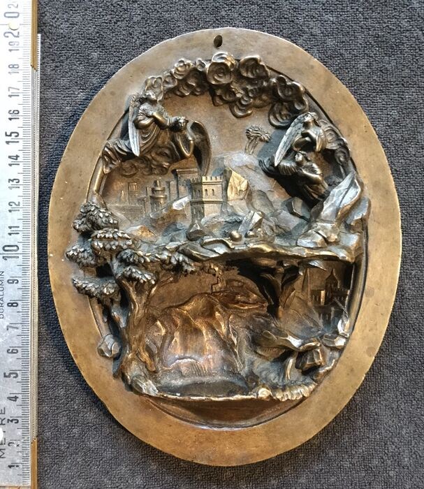 Goede staat, lichte slijtage en krassen op de patina. Een begin van boren aan de voorkant. Een piton met ophangring aan de achterkant.