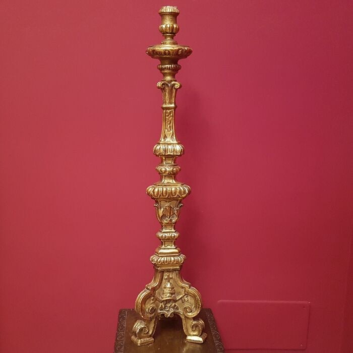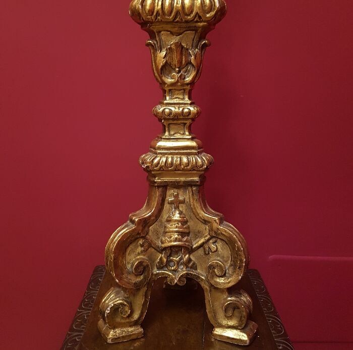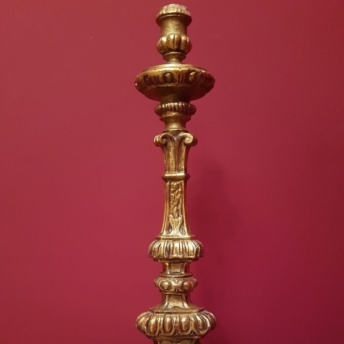 Prachtige en imposante fakkel gemaakt van hout en bladgoud, daterend uit het begin van de 20e eeuw, van verfijnd Italiaans vakmanschap van religieuze kunst uit die tijd.