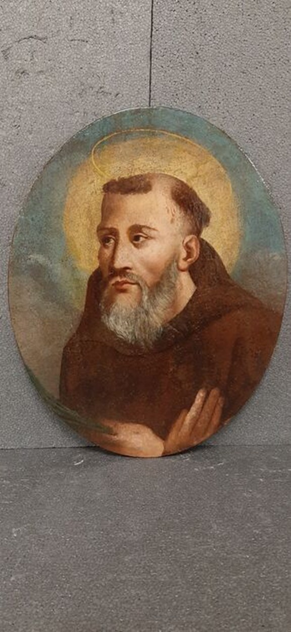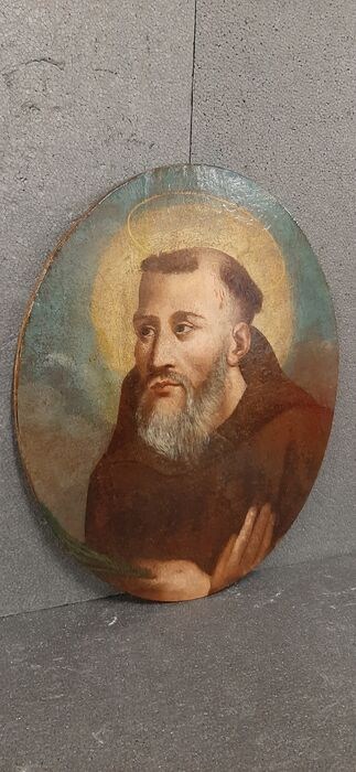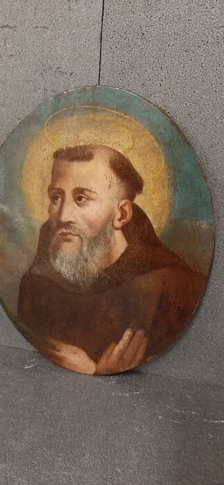 Olieverfschilderij op canvas op hout, uit het einde van de 17e eeuw, met het portret van "Sant'Antonio Abate". Noord-Italiaanse gebiedsschildering, met patina van tijd en oude polychromierestauraties. De heilige verschijnt met zijn handen op zijn borst, een aureool op een gedeeltelijk vergulde achtergrond.