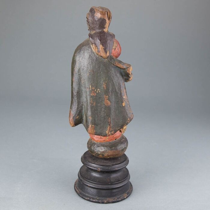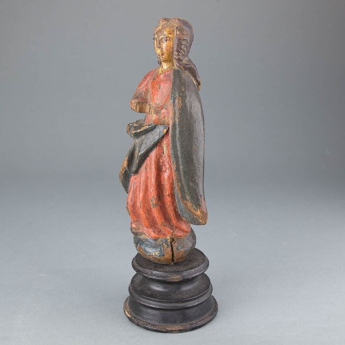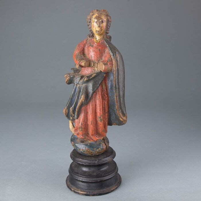 Een prachtig en zeer zeldzaam 18e-eeuws volkskunstbeeld van de Maagd Maria, staande op een wereldbol en een maansikkel aan haar voeten, haar handen gevouwen in gebed, die de Onbevlekte Ontvangenis voorstelt. (Zie voor vergelijkbare iconografie de laatste foto met Tiepolo's Onbevlekte Ontvangenis - Prado, Spanje).
