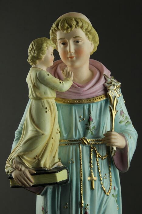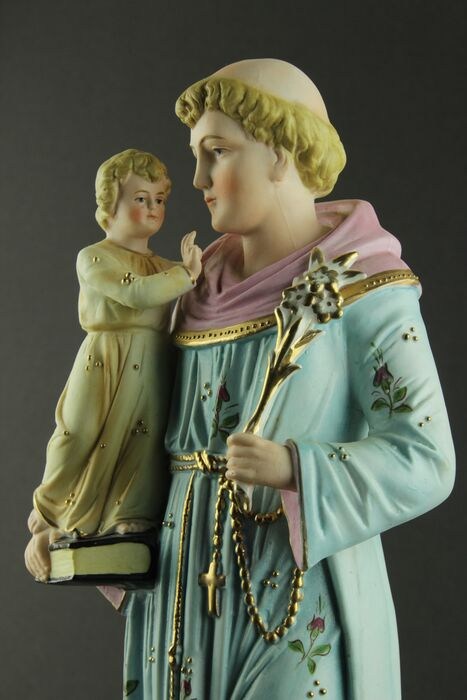 Mooi beeld in veelkleurig biscuit van Sint Antonius van Padua met Jezus.