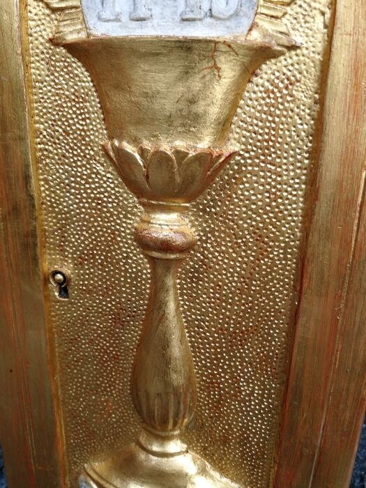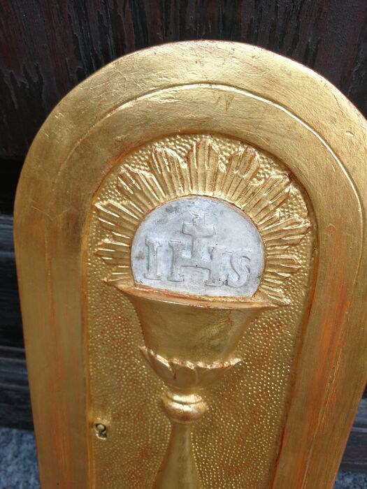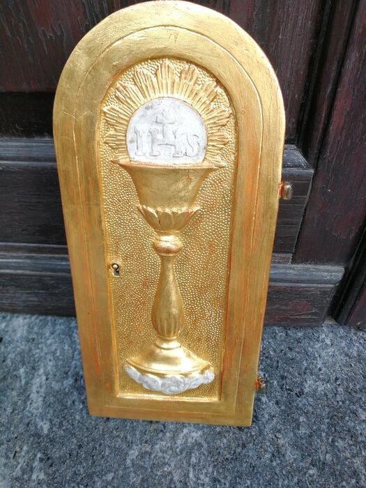 Kleine tabernakeldeur, fijn verguld en gegraveerd, met kelk, deeltje en onderliggende wolk. De structuur is van ijzer met een slot (de sleutel ontbreekt). Afmeting 34x15cm. In goede staat.