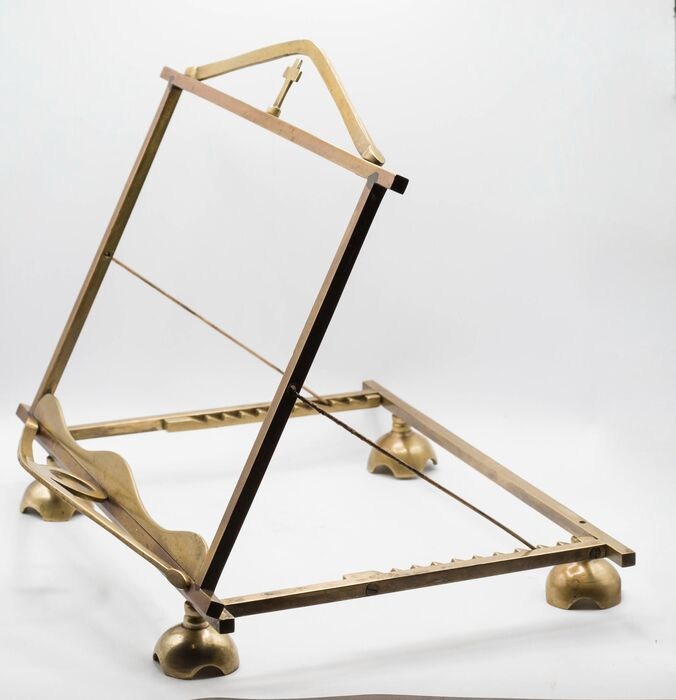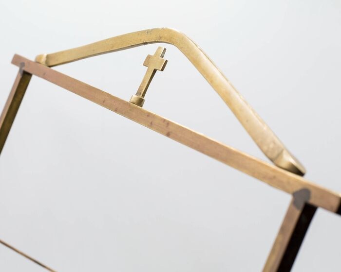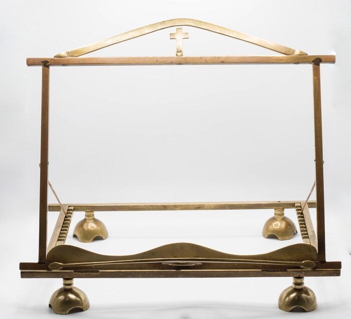Deze lessenaar was van een familie uit Rome in de omgeving van het Vaticaan. Het was in hun privékapel. Het is gemaakt van messing, 4 halfronde voeten, verschillende posities voor hoogteverstelling. Hij is 33 cm lang en weegt ongeveer 1,7 kg. Nog in uitstekende cosmetische en gebruikte staat. De talrijke foto's tonen zijn kenmerken en schoonheid.