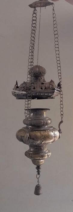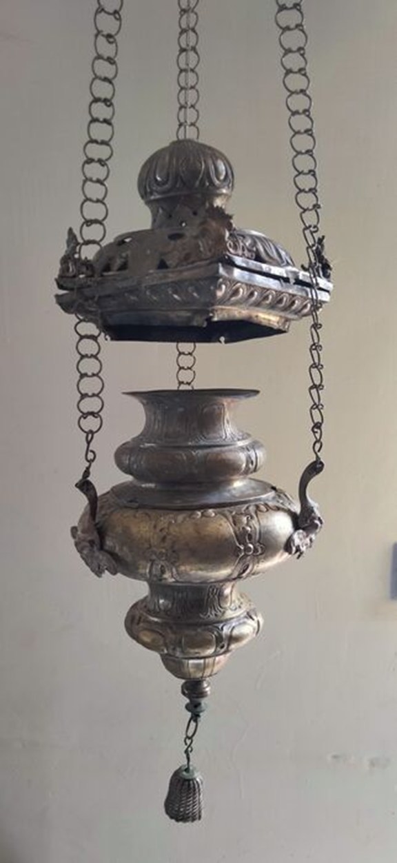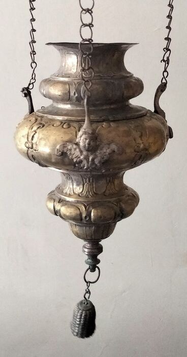 Groot liturgisch wierookvat in messing met bronzen afwerkingen.