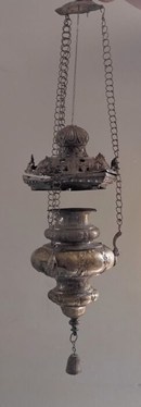 Bovenop elegante vijfhoekige kroon, wellicht aangepast, verguld en verzilverd.