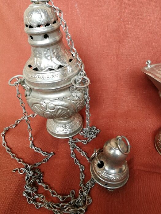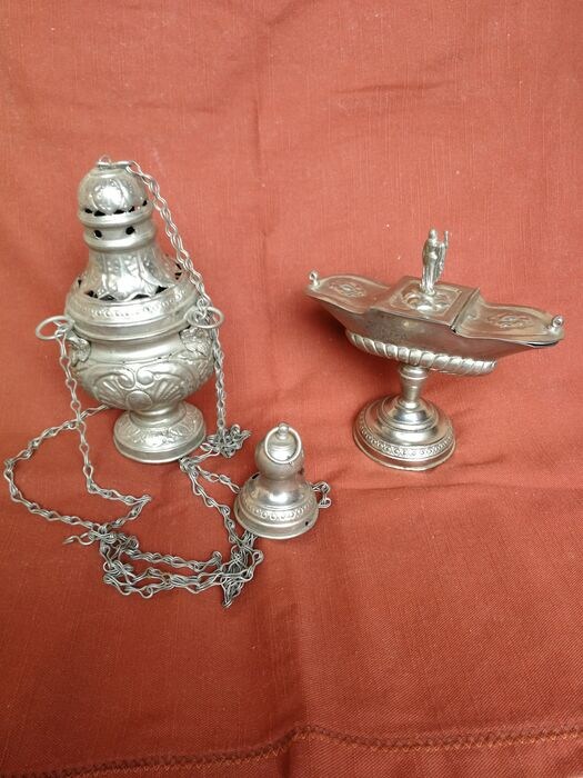 Thurible en boot (hanger) voor religieuze functies, oude goed onderhouden en gebeiteld, de Thurible heeft zijn eigen houder voor houtskool. Klaar voor gebruik.