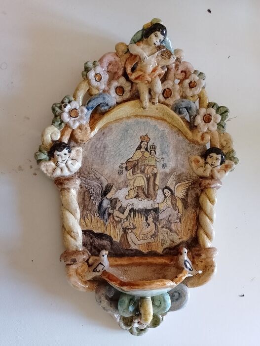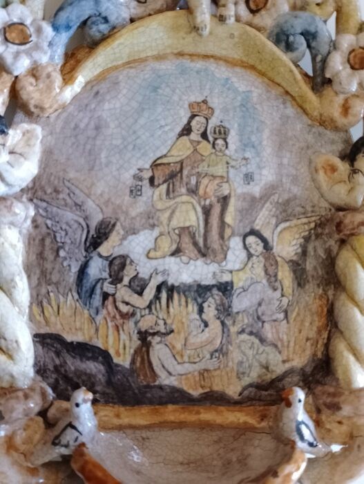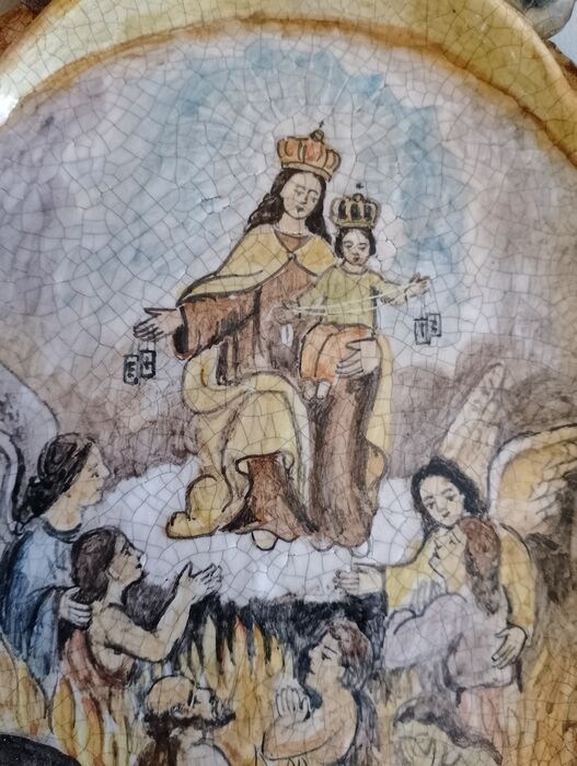 Onze-Lieve-Vrouw van de berg Karmel in het vagevuur. Oude keramische ketel uit begin 1900. Prachtige kleuren en mooie craquelé over het gehele oppervlak. Goede algemene voorwaarden. Afkomstig uit een oude keramiekwerkplaats in de omgeving van Salerno. Object uit een privécollectie. Ik verzend in een uitstekende verpakking met tracking, met geschikt materiaal gezien de delicaatheid van het object. Materiaalkosten bij verzending inbegrepen