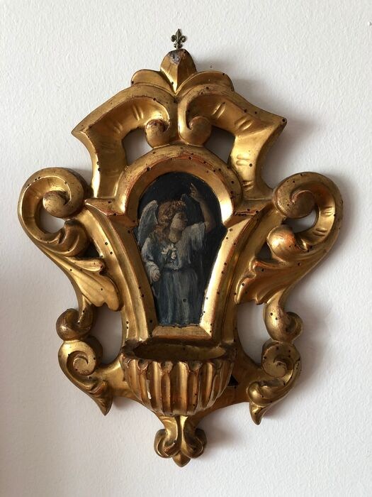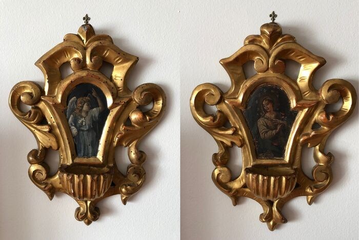 Paar gebeeldhouwde en vergulde zachthouten krukjes voor het nachtkastje. ze hebben centrale cartouches met een afbeelding van de Annunciatie gemaakt in olieverf op hout. de eerste beeltenis van de aartsengel Gabriƫl, de tweede de Madonna. de schilderijen zijn zo gemaakt dat de twee stoups met elkaar "in dialoog" gaan. In goede staat met tekenen van de tijd.