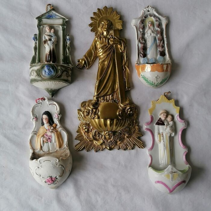 4 wijwatervatjes van Duitse makelij, gebruiktzijn geweest kan je aan de kalksporen zien