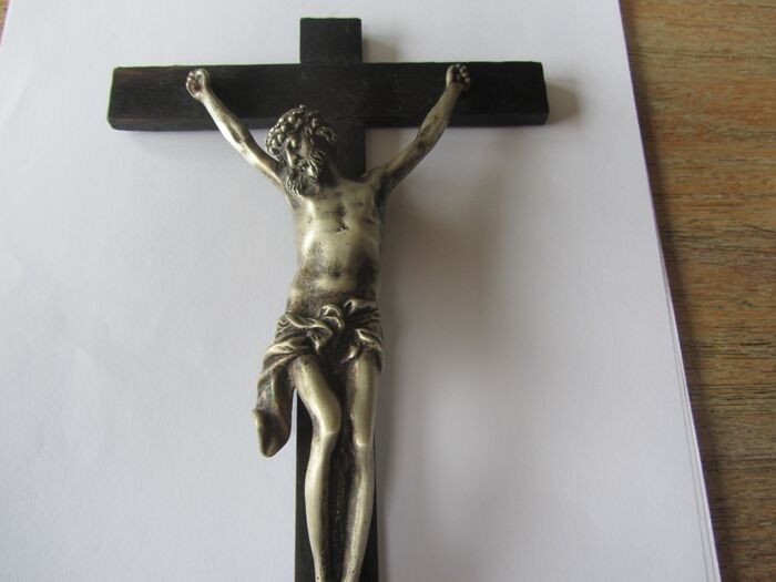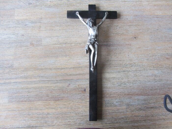 een zilveren cristus op een gezwart houten kruis. in mooie ongepoetste staat. lengte 31 cm breedte 16 cm en 0,6 cm dik. gewicht bruto 370 gram netto ± 340 gram. Keuren WF in rechthoek Jaarletter R Lopende leeuw en dieren kop panter Londen.Kruis kan open geklapt worden om de keuren te zien, zie fotos. Herkomst England. Zonder schade of herstellingen. Word aangetekend terdege ingepakt en verzekerd verzonden