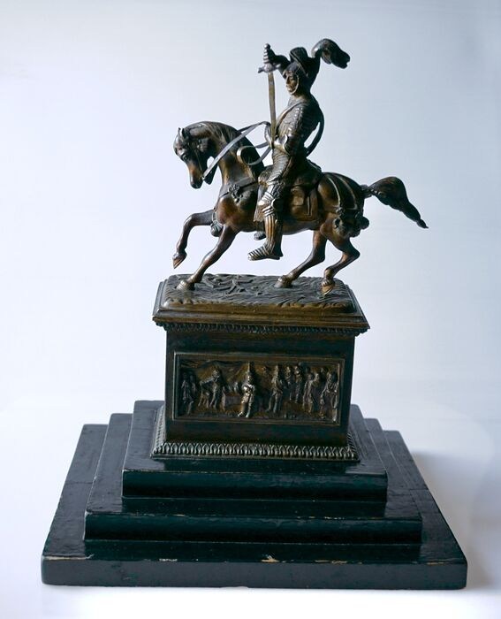 Een aantrekkelijk ruiterstandbeeld van Emanuel Philibert de Savoye naar Carlo Marochetti (1805 - 1867). Gemaakt van spelter, op een gepatineerde spelter voet, die een zwarte houten sokkel heeft. Periode begin 20e eeuw.