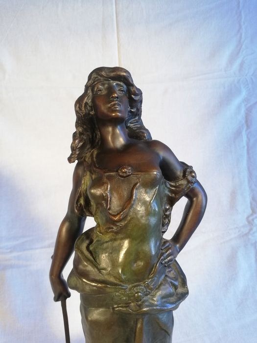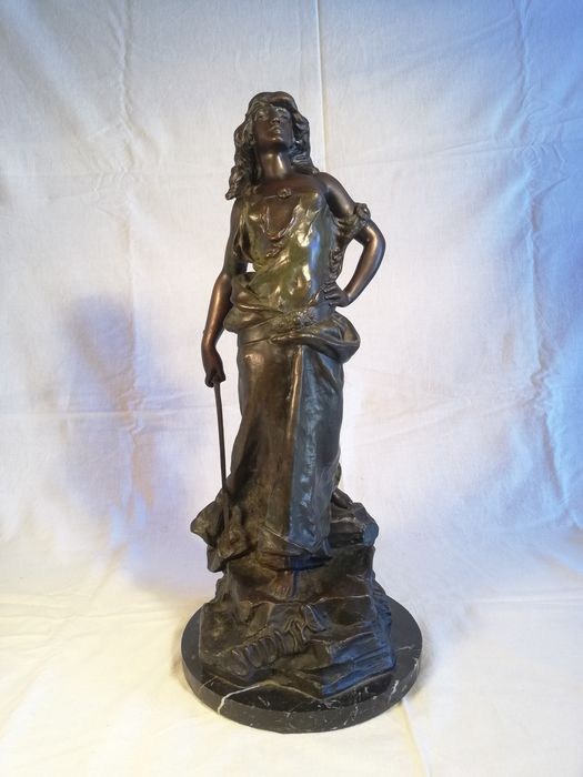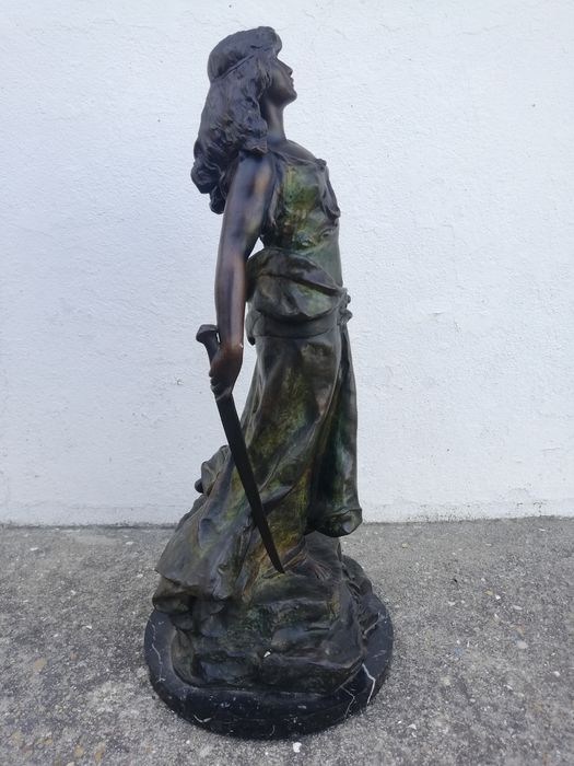 Sculptuur van een vrouwenfiguur "Judith" in brons met een zwart marmeren voet.