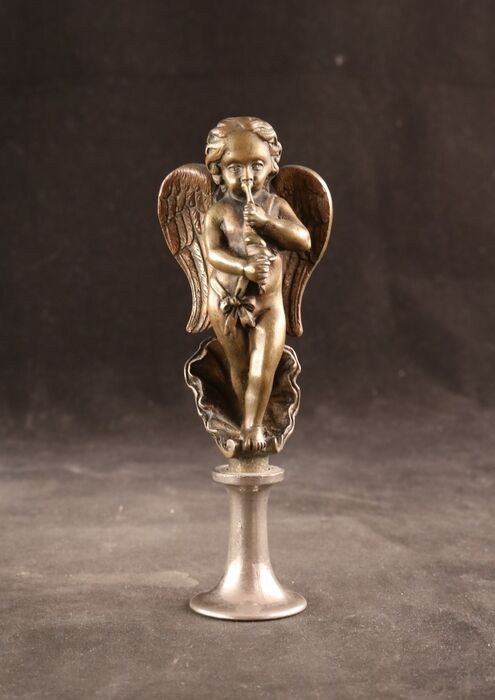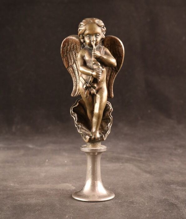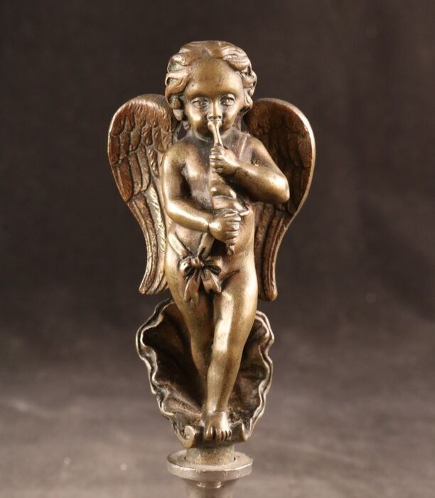 Zeer fraai antiek massief bronzen sculptuurtje voorstellende een in een schelp staande muziek makende cherubijn met fluit, strik en vleugels.