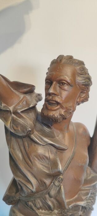 Beeld, spelter, voorstellende een schipbreukeling met vlag staande op de resten van een scheepswrak. Het beeld is in zeer goede staat, het is 72 cm hoog en weegt 6,7 kg. Het pakket wordt zeer goed verpakt en zeer snel verzonden.