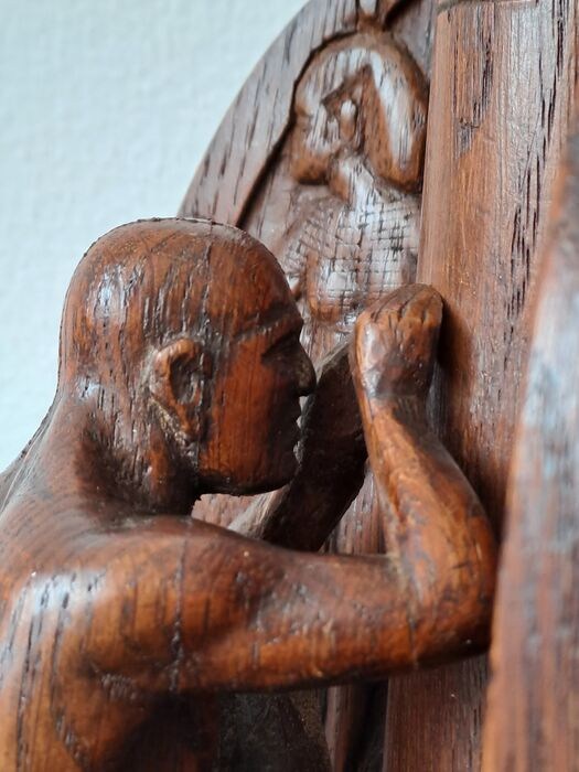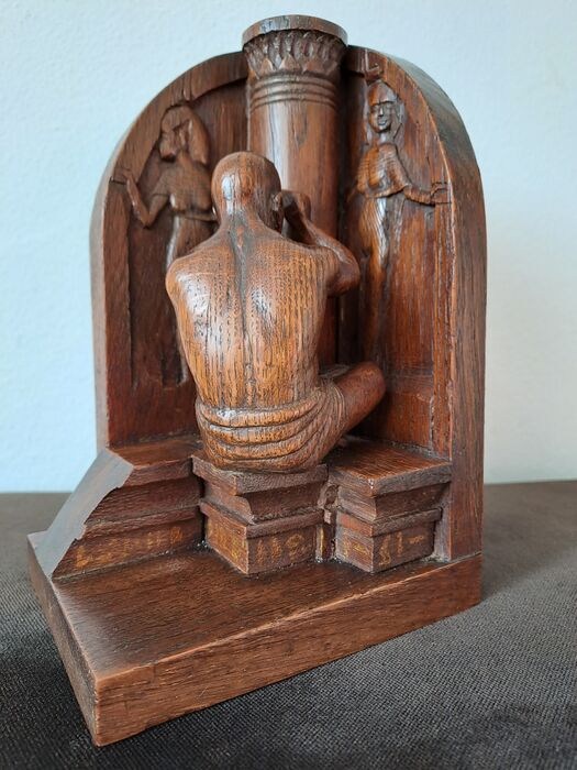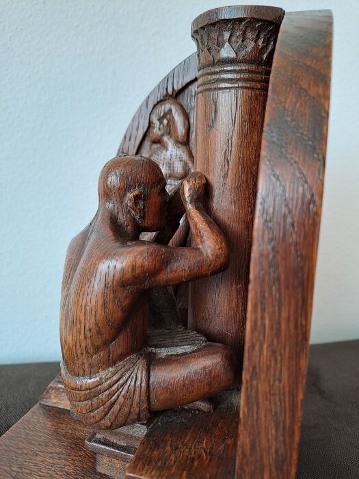 Bijzonder eikenhouten beeld van een beeldhouwer aan het werk. De man stelt vermoedelijk een bewoner uit het oude Midden-Oosten voor.