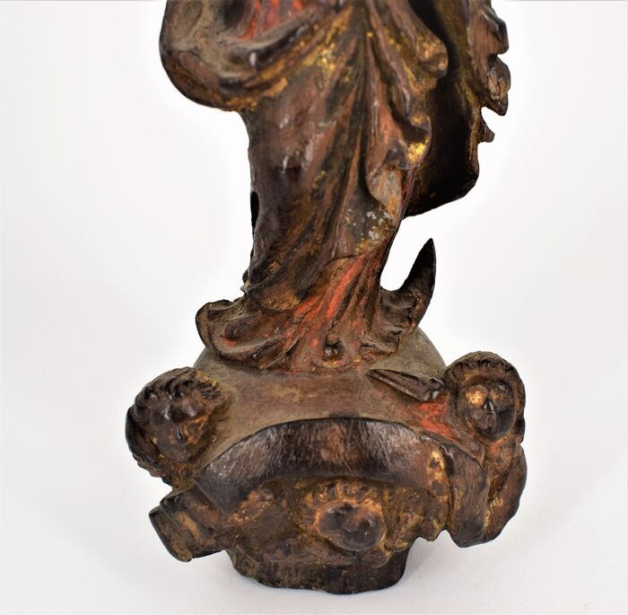 Het is een typische uiting van de Napolitaanse barok met drapering van de mantel, sporen van blauw en goud, de lange jurk rust op de wolk en op de maansikkel (een stukje van de maansikkel ontbreekt).