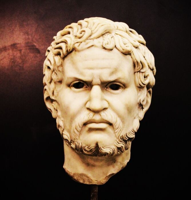 Masker van Caracalla in wit marmer, 20e eeuw, hoogte 61 cm met de hele basis, uit onze ervaringen zou het beeld een belangrijke hand moeten zijn.