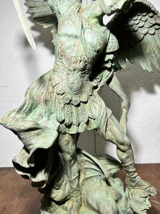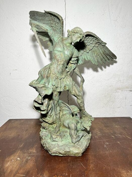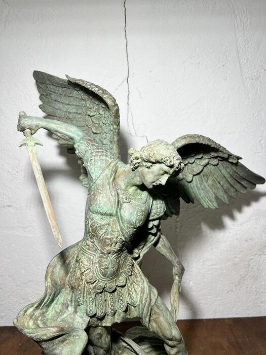 Monumentaal bronzen beeld, verloren was gieten, voorstellende de aartsengel Michaël tijdens het doden van Lucifer. Werk uit een Florentijnse privécollectie. Het vertegenwoordigt de overwinning van het goede op het kwade. De patina is opmerkelijk.
