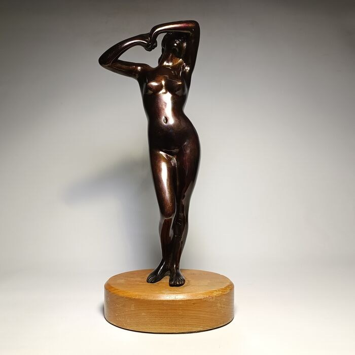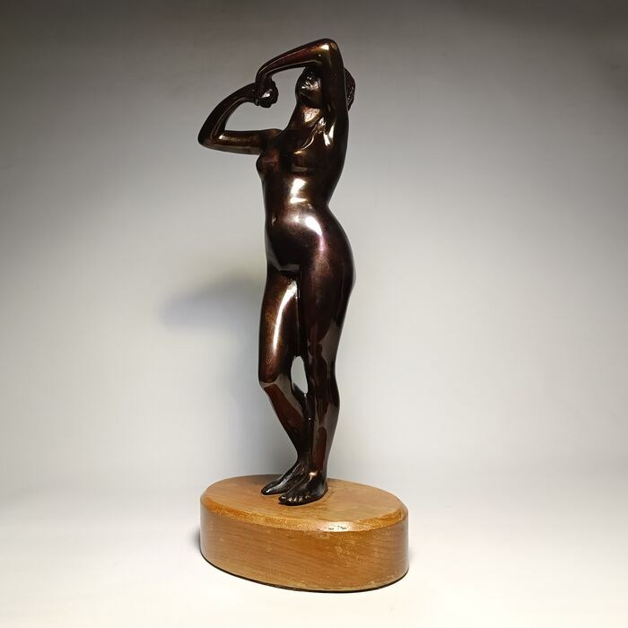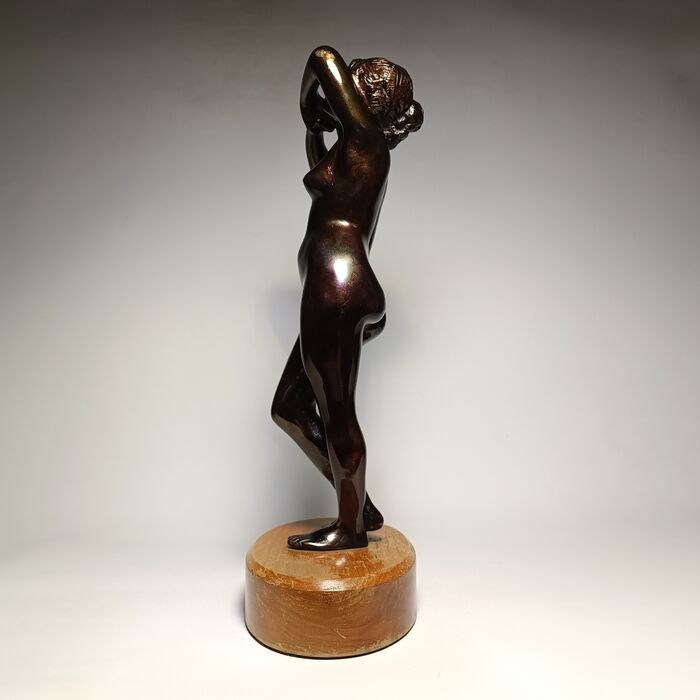 Prachtig art deco bronzen beeld van een jonge naakte dame op houten sokkel, uit de 1e helft 20e eeuw.