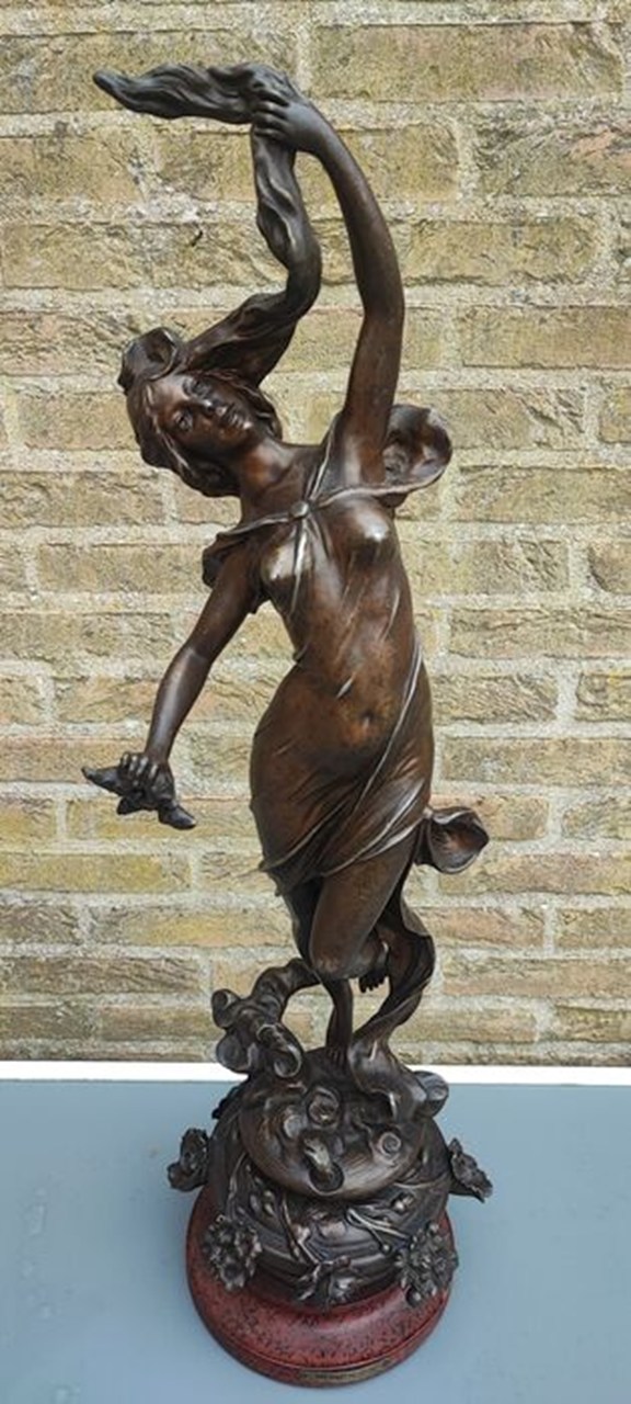 Groot beeld van Emile Fuchs (1866-1929) getiteld "Les Parfums - Fleurs" 76 cm. Emil Fuchs komt uit Oostenrijk, maar verbleef vooral in Londen en New York.