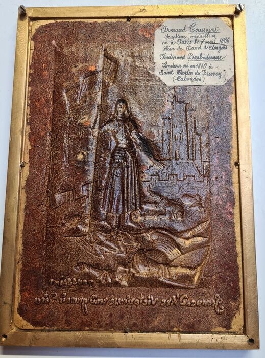 Bronzen reliƫf met afbeelding van Jeanne d'Arc.