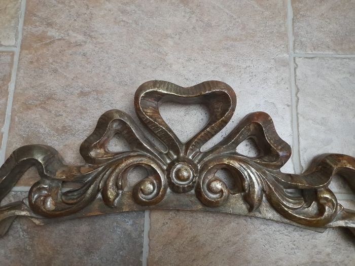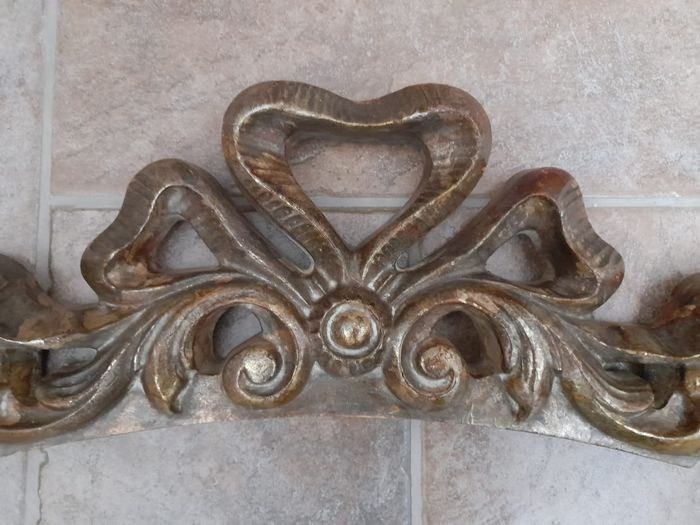 Sculptuur in gebeeldhouwd hout, in de vorm van een boog, beschilderd met decapè en platina tinten. 65x15x3cm.