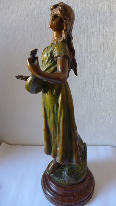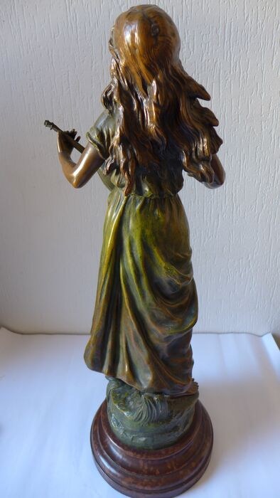 Metalen plaatje met opschrift 'MIGNON par L&F Moreau gold medal' en tevens gesigneerd op het beeld zelf.