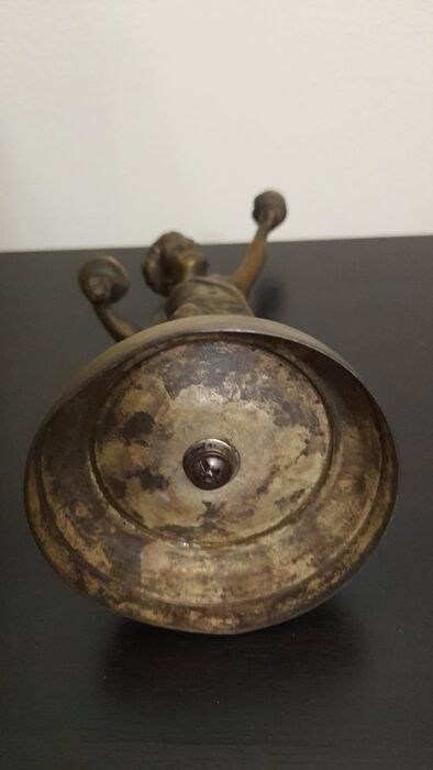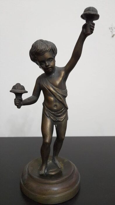 Oud bronzen beeld van een putto met rammelaars.
