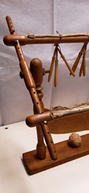 Op twee van deze houten staven, linialen genaamd, wordt een lint bevestigd waarop de te borduren stof wordt genaaid, waarna de andere twee houten staven worden gestoken, waarbij hun afstand op de linialen wordt geregeld met behulp van beweegbare spijkers en het borduren gaat verder. Aanwezig 10 antieke houten spoel klossen met draad + antieke band met geperforeerde ontwerpen