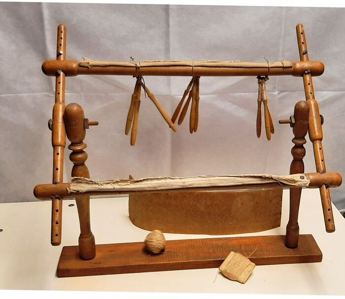 Antiek rechthoekig houten weefgetouw + 10 klossen voor kant + opengewerkte borduurband - Eind 19e eeuw - Italiƫ