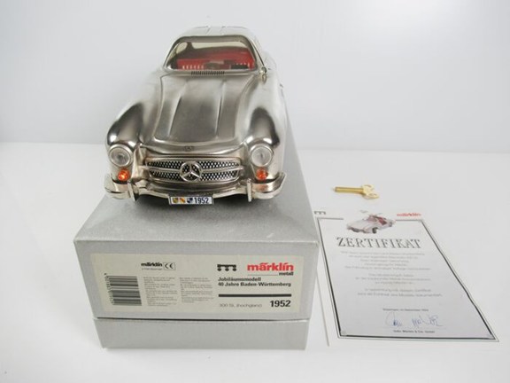 Schitterende zilveren Mercedes 300 SL (vleugeldeur) van Marklin, geheel in metaal uitgevoerd inclusief de originele verpakking, certificaat en messing opwindsleutel (niet origineel, wel functioneel) voor het uurwerkmotortje.