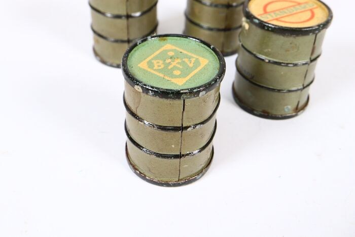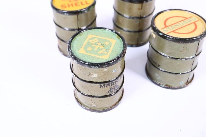 Vier fraaie blikken Märklin tonnetjes/vaten met opschriften. De vaten verkeren in een nette staat, uiteraard, met enkele gebruikssporen.