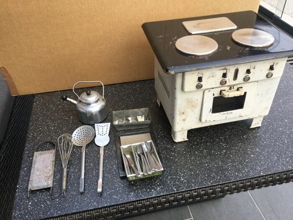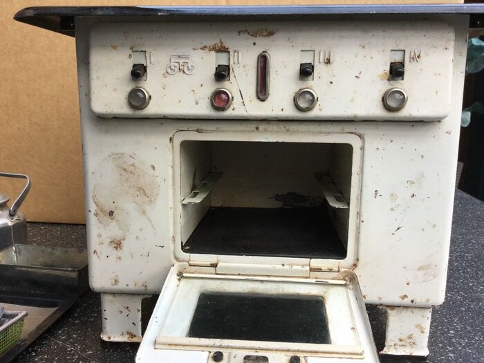 Antiek poppenkacheltje van Märklin met toebehoren zonder stroomkabel.