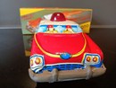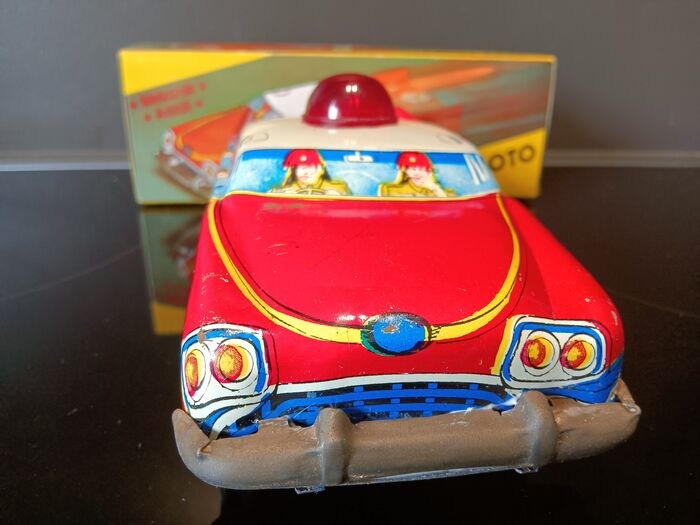 De auto is in goede tot zeer goede staat. De wielen draaien en maken een geluid alsof je een motor hoort. De zwaailamp is aanwezig en onbeschadigd. De lak en de daarop aangebrachte afbeeldingen zijn in zeer goede staat. Her en der is wel een vlekje of lichte beschadiging te zien, de bumpers en wieldoppen hebben een mooi patina,te verwachten bij zo'n stuk speelgoed uit 1970.
