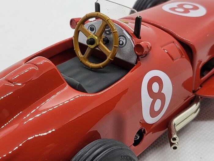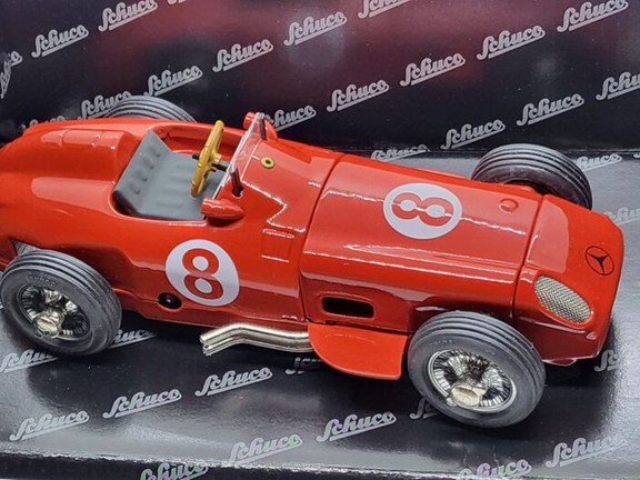 Schuco Mercedes - Benz W 196 Monoposto met het artikelnummer 06042 in zeer goede staat (zie foto's) met het gereedschap en de sleutel om hem op te winden in de originele verpakking. De auto is geproduceerd in een beperkte oplage (het certificaat zit in de originele verpakking) en werkt zeer goed. De originele verpakking heeft opslagsporen.